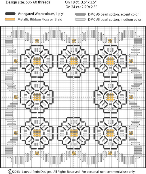 And all that needs to be done is: stitch the center circle with your metallic thread, along with the four diagonal stitches in an accent color. Lastly, add your beads (or french knots), as I've suggested in the above graph.