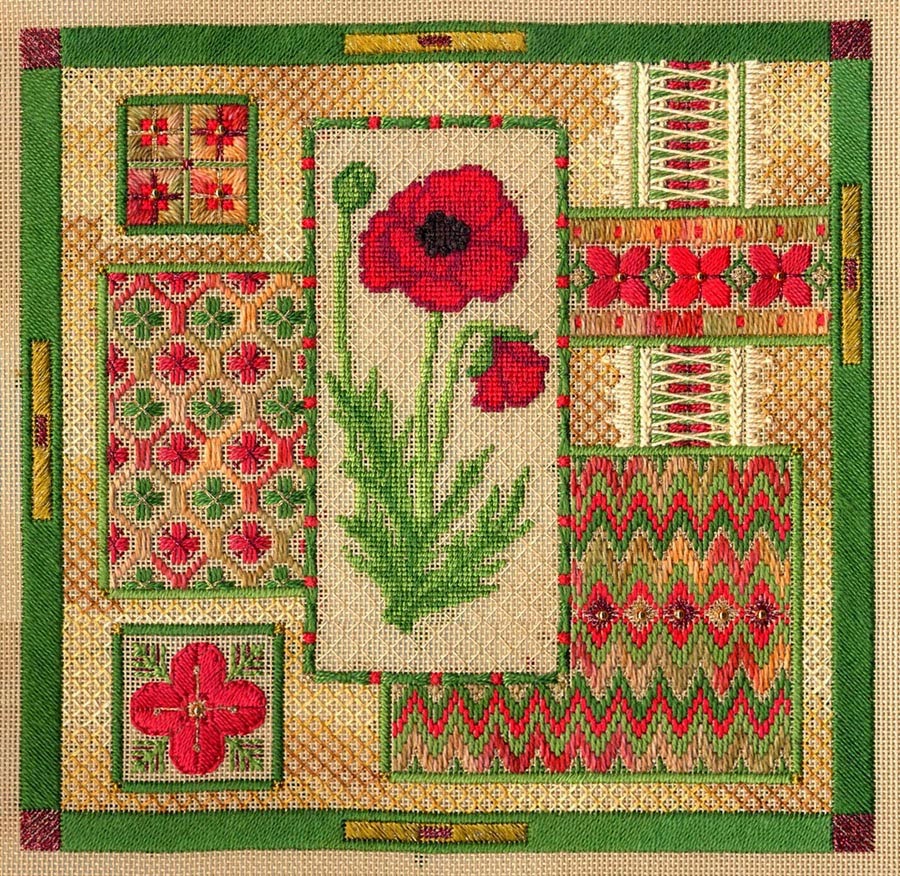 What the photo doesn't really show you is that the entire floral pattern in the background is worked in simple Tent Stitch, using a glitzy Kreinik #8 Braid (6 spools, to be exact!), while the rest of the sandstone canvas is left